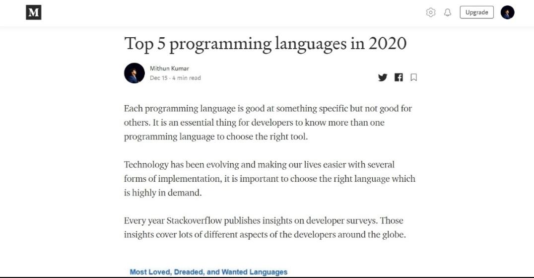Check out my new article - Top 5 programming languages in 2020. This is based on the Stackoverflow annual developer survey and as well as my own experience. https://lnkd.in/fR6dQ29 #python #javascript #Java #swift #golang #2020predicitions