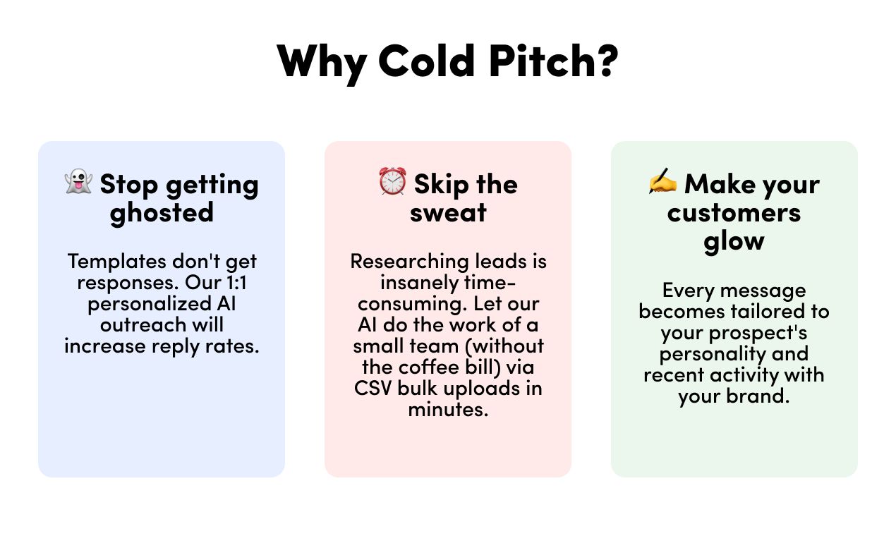 Say goodbye to templates and the frustration of low conversion rates. Cold Pitch AI streamlines your outreach efforts, ensuring your emails resonate with your target audience and deliver better results. This means not only saving you time but also maximizing your ROI.